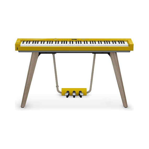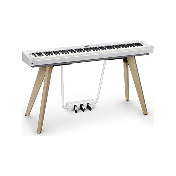The integrated three-pedal unit provides damper, sostenuto and soft pedal controls, the same as a traditional grand piano. The damper pedal is continuous, meaning that the PX-S7000 can vary the degree of damper sustain depending on how fully the pedal is depressed, making effects such as half-pedalling possible. In addition, the soft pedal also has two-position sensing, allowing for variation in the amount of expressive effect achieved.